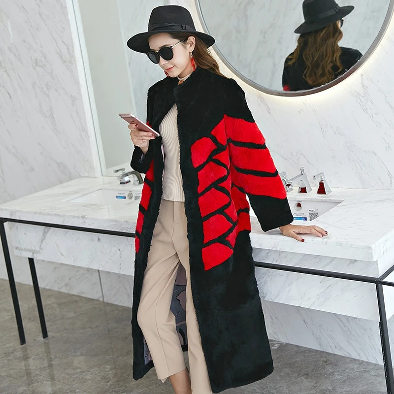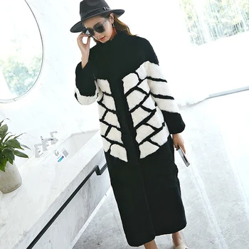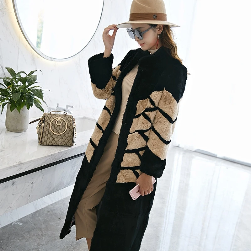 Product Name: 2019 Herbst Winter Neue Ganze Haut Natürliche Rex Kaninchen Pelz Mäntel Frauen Kontrast Farbe Stehkragen Lange Stil Echtpelz Jacken