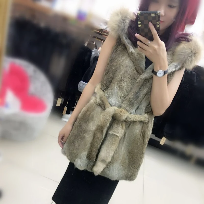 Product Name: (TopFurMall) Dame-Fashion Genuine Wholeskin Kaninchenfell Weste WaschbÀr Pelz Hoody Frauen Echtpelz Gilet Schlanke Taille LF4128