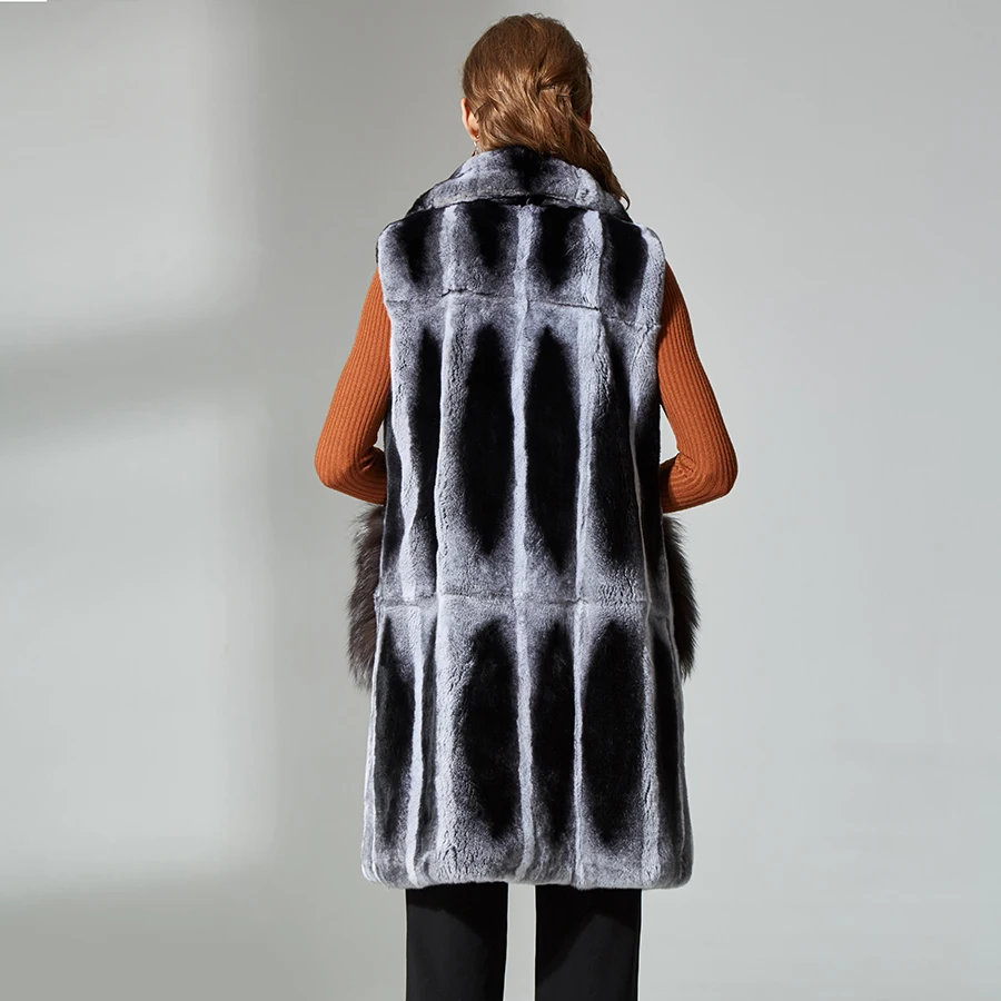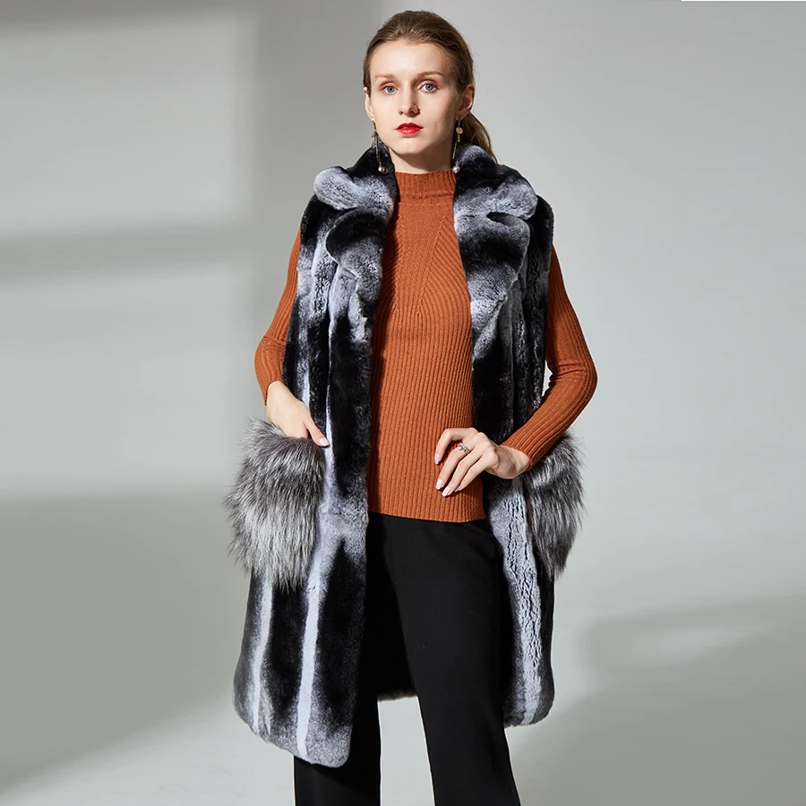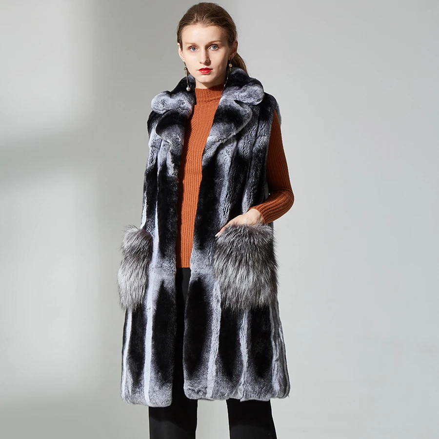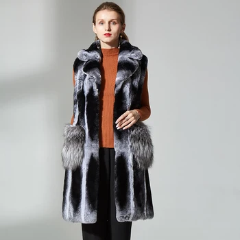 Product Name: Chinchilla Weste Splitter Fuchs Pelz Tasche Trimmigs Neue Frauen Echt Rex Kaninchen Pelz Weste Chinchilla Colur Echt Pelz Gilet 90 Cm Lange