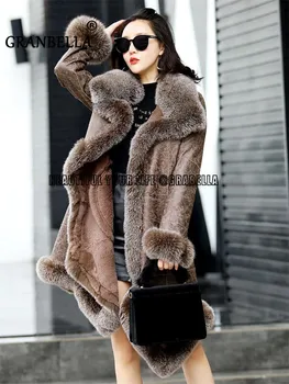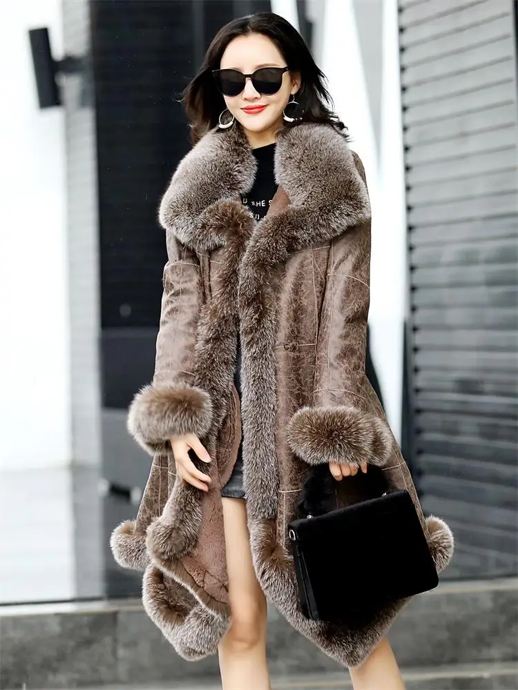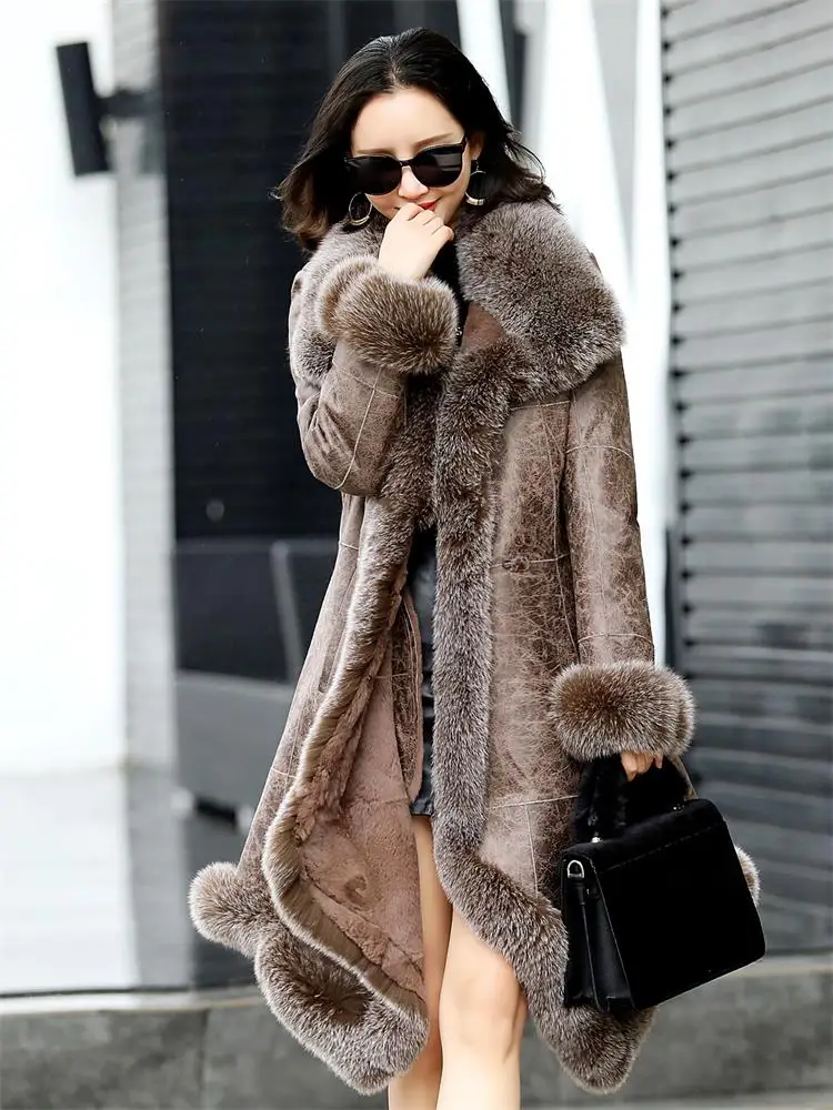 Product Name: Mid-länge Natürliche Kaninchen Fell Mantel Frauen Leder Langen Mantel Mit Echt Fuchs Pelz Trimmen Kragen Mode Dünne Gürtel Frauen Mantel