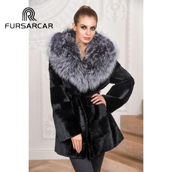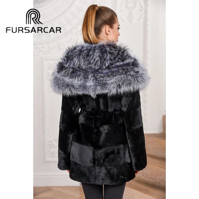 Product Name: FURSARCAR Winter Neue Ankunft Echt Pelzmantel Frauen Echte Rex Kaninchen Pelz Jacke Mit Silber Fuchs Pelz Kapuze Starke Warme Weiblichen Mantel