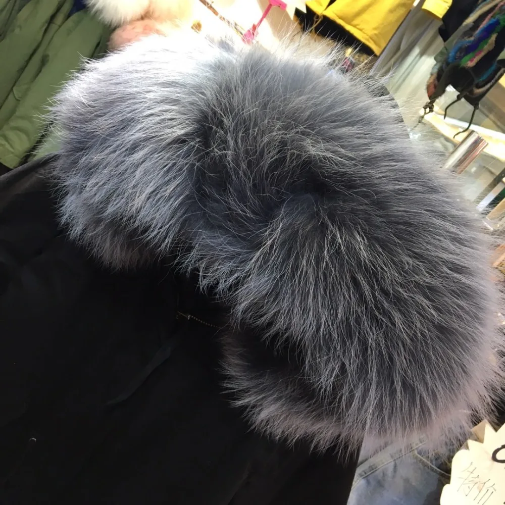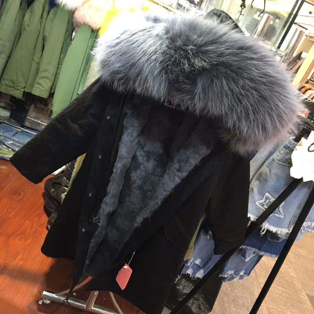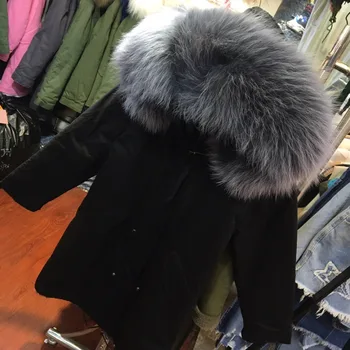 Product Name: 2018 Grau Rex Kaninchen Pelz Futter Große Kragen Damen Winter Schwarz Lange Shell Runway Warme Parka Echtpelz Mantel