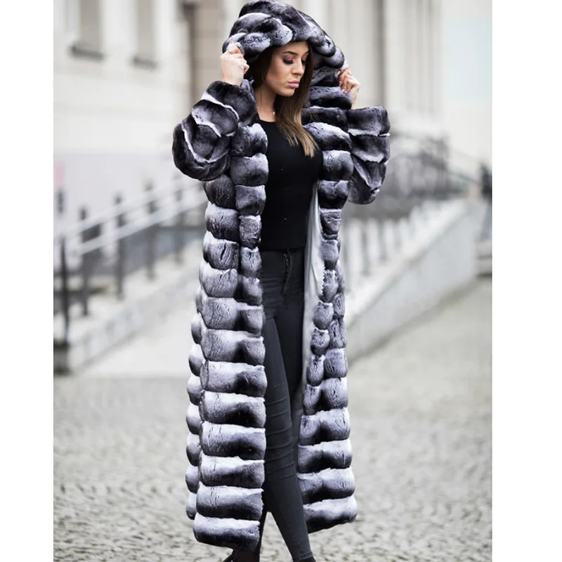 Product Name: FURSARCAR Luxus 130cm X-Lange Frauen Natürliche Rex Kaninchen Echtpelz Mantel Woolen Haut Pelzmantel Rex Kaninchen Pelz Kragen Echtpelz Jacke